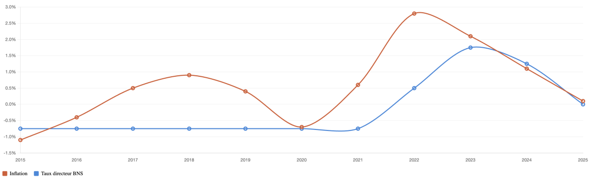 Actuellement, les taux directeurs de la BNS se situent autour de 0%, reflétant une politique monétaire accommodante visant à soutenir l'économie dans un contexte de croissance modérée.