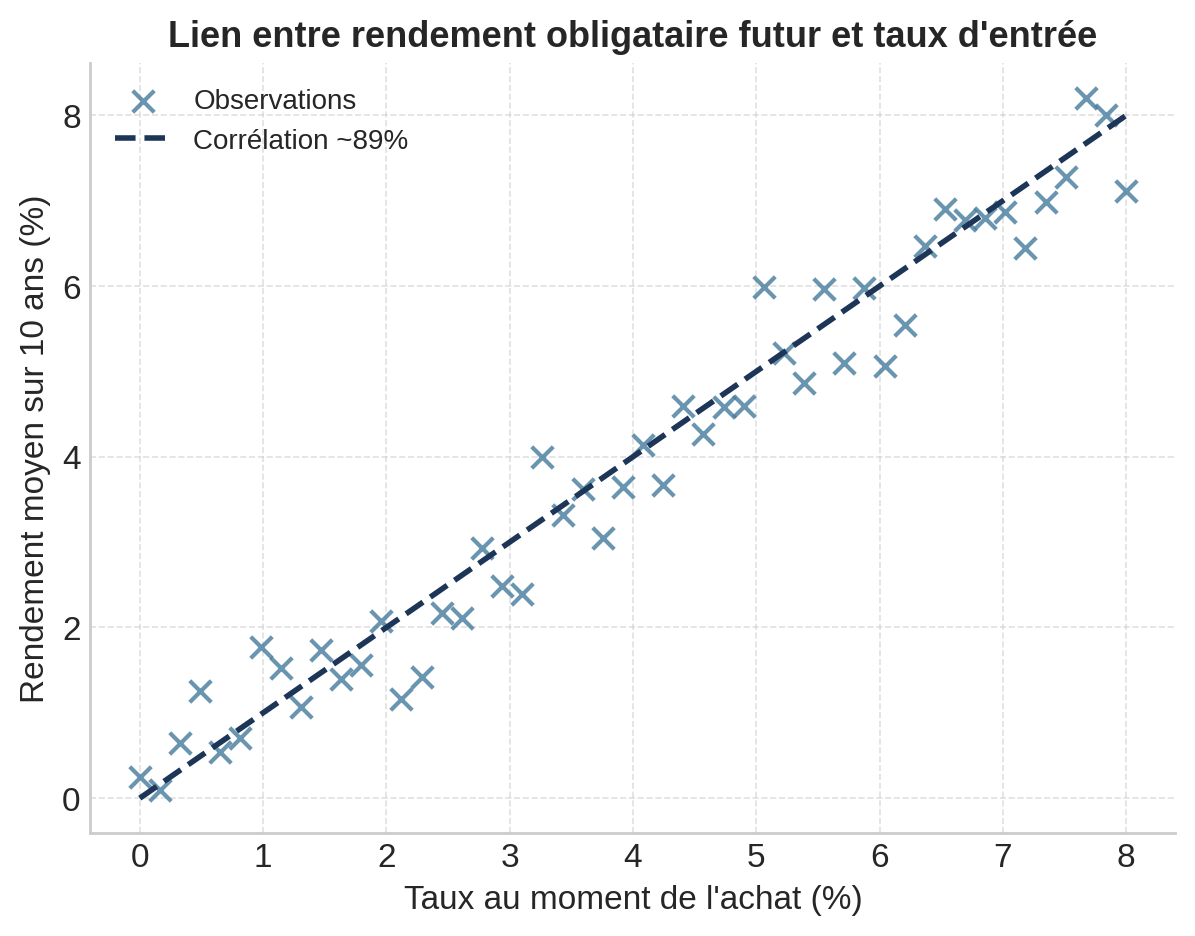 À cela s’ajoute un élément essentiel souvent sous-estimé : le rendement futur d’une obligation est quasi intégralement déterminé par le niveau de taux au moment de l’achat. Les données historiques montrent une corrélation de près de 89 % entre le rendement total sur 10 ans et le taux d’entrée.