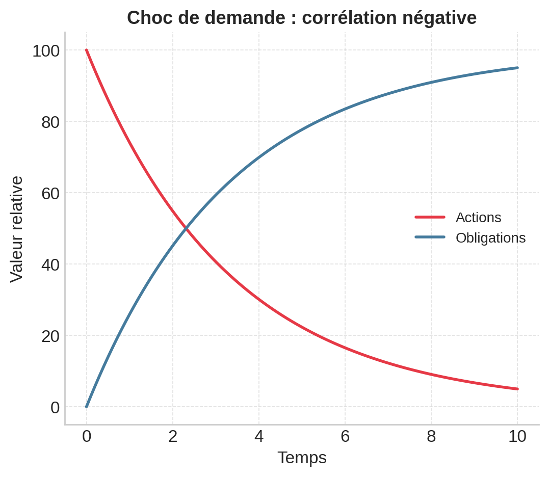 Lors d’un choc de demande, typiquement une récession, une crise financière ou un événement brutal qui entraîne une chute de la consommation et de l’investissement, les actions corrigent fortement. Dans ce contexte, les banques centrales réagissent en abaissant leurs taux et les obligations d’État s’apprécient. On observe alors une corrélation négative entre actions et obligations, et le portefeuille équilibré fonctionne comme prévu : les gains obligataires compensent les pertes sur actions.