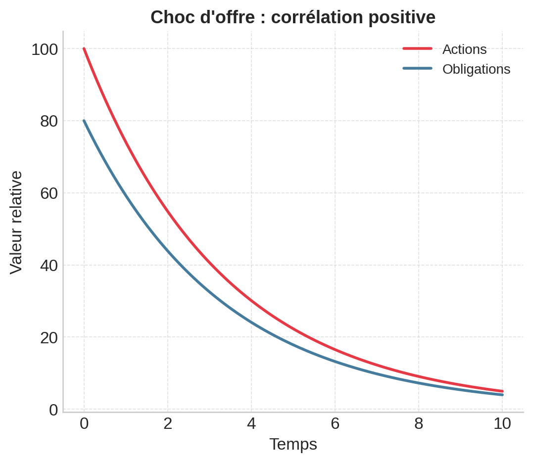 En cas de choc de demande, actions et obligations évoluent en sens inverse, ce qui crée une véritable protection. Mais en cas de choc d’offre, elles chutent ensemble et le rôle défensif des obligations disparaît.